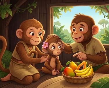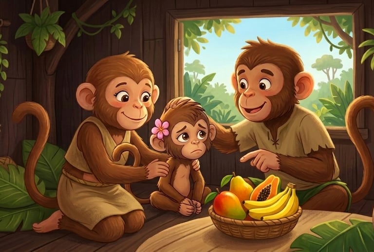 Just then, his mom and dad came home. Tobu told them everything. He said, "I was greedy and didn't share. Now all the bananas are ruined." He felt bad for breaking his promise to his friends.