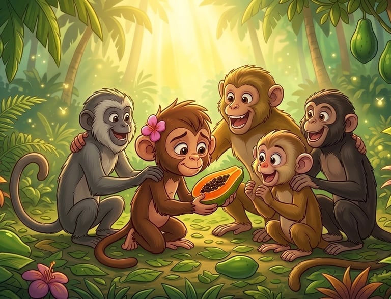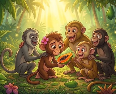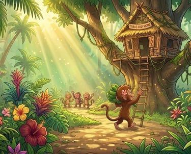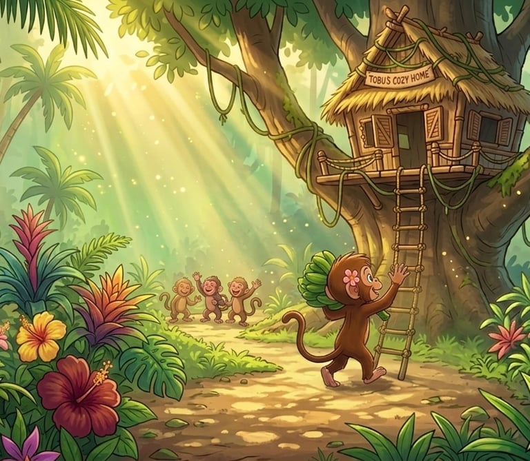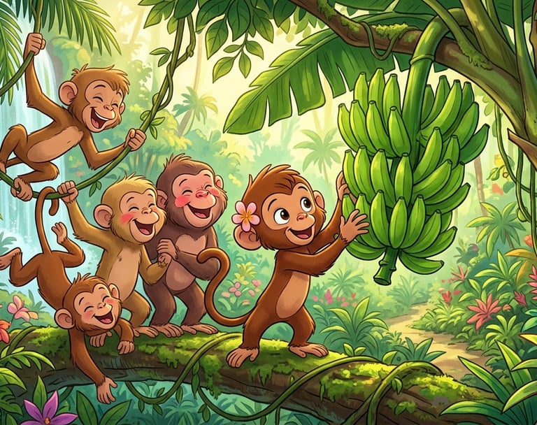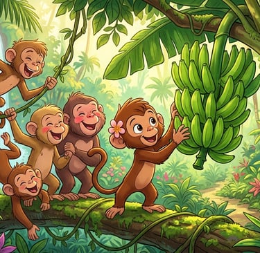 Tobu was a little happy monkey in a beautiful jungle. One sunny day Tobu and his friends found a big bunch of bananas in the forest. The bananas were green and hard. They were not ready to eat yet, but the monkeys were very excited!