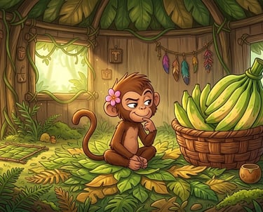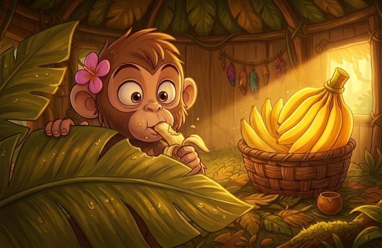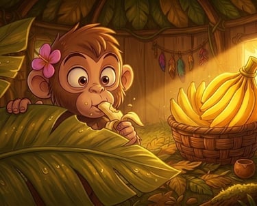 A few days later, the bananas turned a beautiful, bright yellow. They smelled delicious! Tobu’s mouth watered. He was so greedy that he tried to eat them slowly, but there were too many for one little monkey.