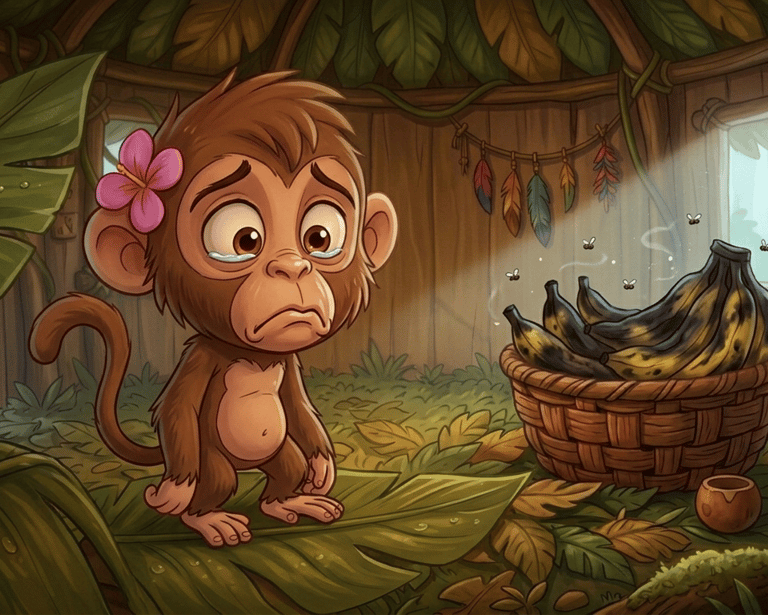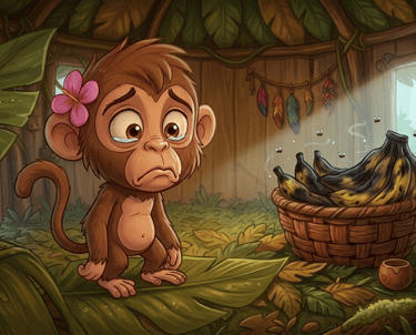 The next morning, Tobu ran to eat his feast. But oh no! The bananas were not yellow anymore. They were black, mushy, and smelly. They had rotted because in the summer, he waited long. He couldn't even eat one banana! Tobu had no bananas to eat, and he felt very sad and lonely.