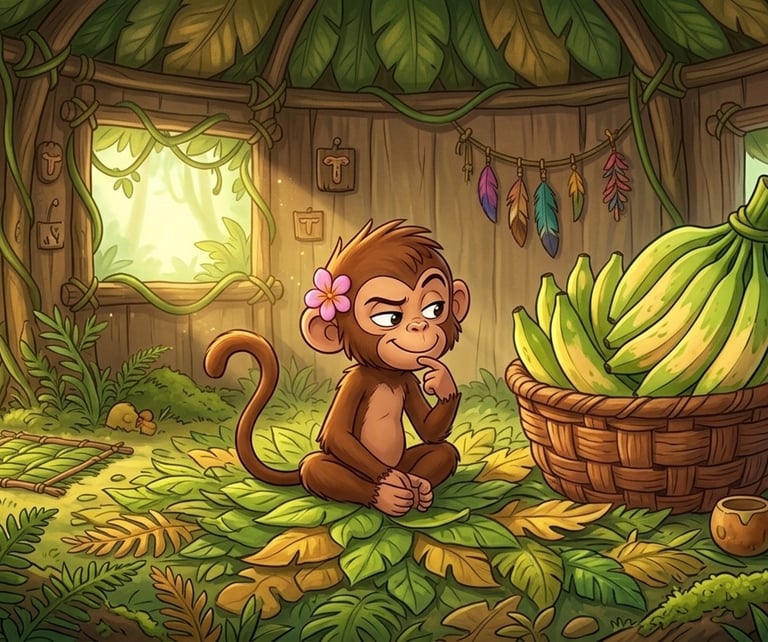Tobu took the bananas home. His mom and dad had to go away for a few days, so Tobu was all by himself. He looked at the green bananas every day, waiting for them to change. He started to think, "If I share these, I will only get a few. If I keep them a secret, I can eat every single one by myself!" He decided not to tell his friends when the fruit got soft.